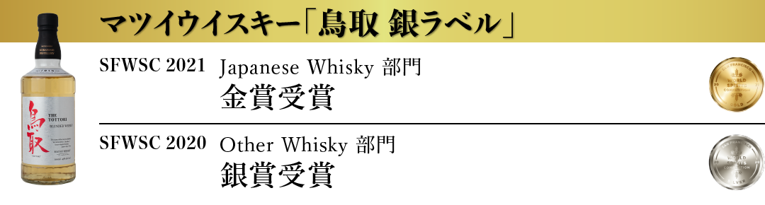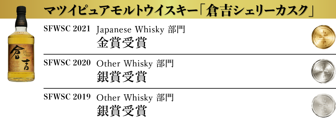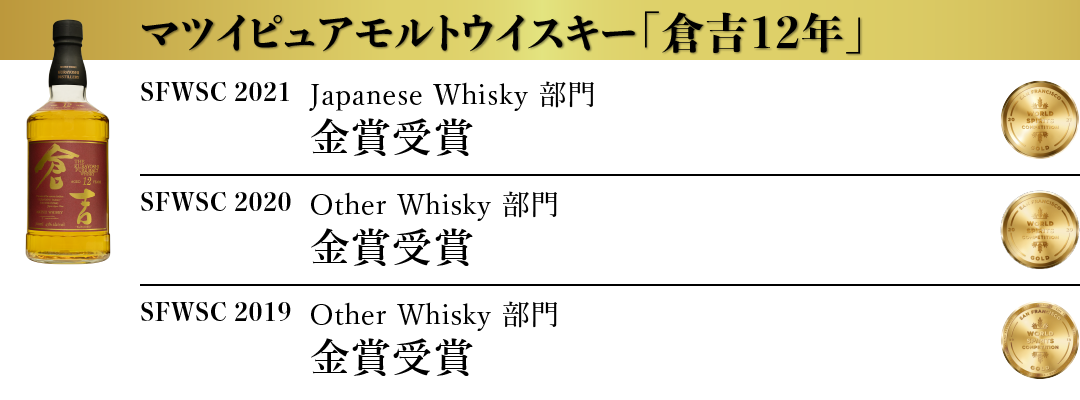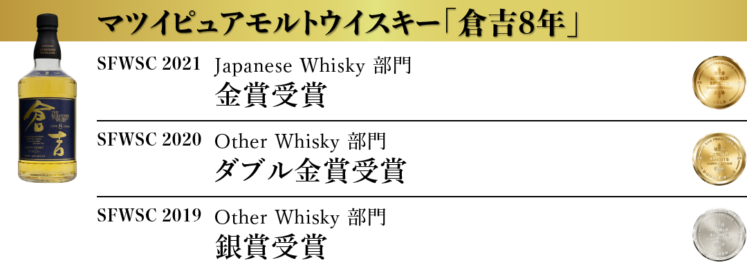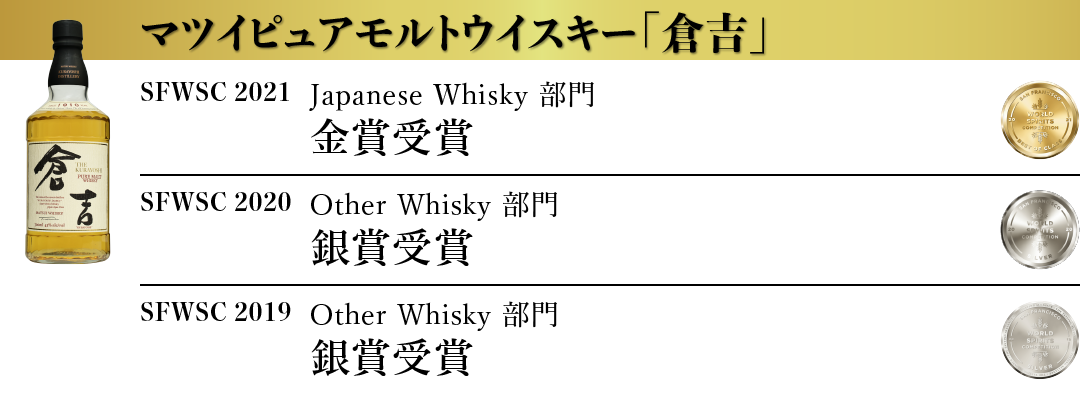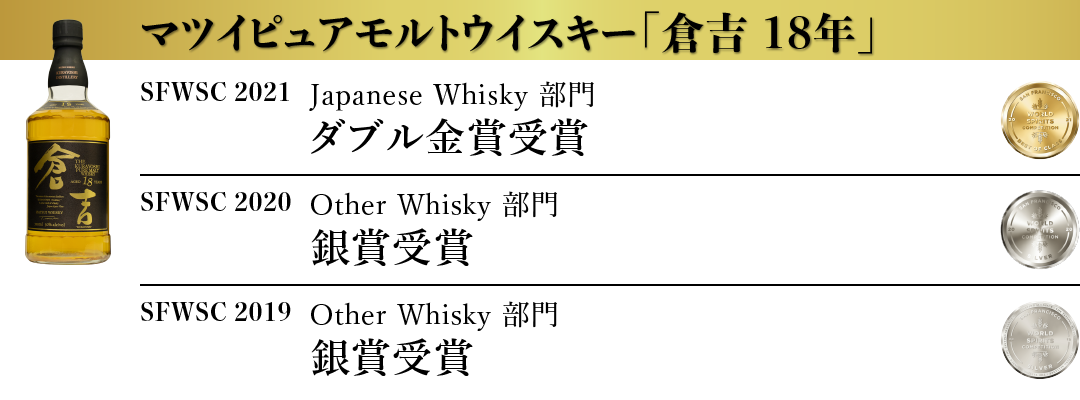 松井酒造合名会社 (以下、倉吉蒸溜所 所在地:鳥取県倉吉市)は、アメリカ最大で世界3大ウイスキー品評会のひとつである San Francisco World Spirits Competiton 2021(以下SFWSC)において『倉吉 18年』のダブル金賞(最高賞)を筆頭に多くのマツイウイスキー製品が賞を受賞いたしました。(弊社プレスリリースhttps://matsuiwhisky.com/blog/20220209/1223/)