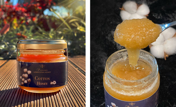 ウズベキスタンは綿花生産の盛んな国。ユーラシア大陸の綿花栽培可能な最北地域で、年間の寒暖差が激しいため害虫の発生率が低く、農薬に依存する必要がありません。大自然にはぐくまれたウズベキスタンのコットンハニーは、有益なビタミンのもとになるエッセンシャルオイルを含み、「食べる美容液」とも呼ばれています。