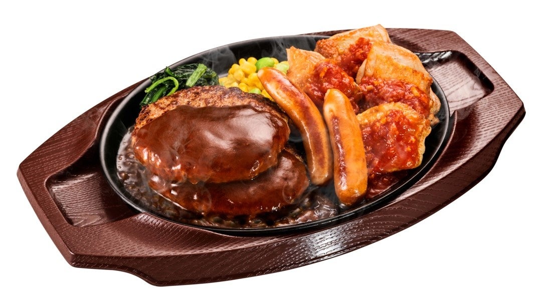 ミックスグリルに+300円(税込330円)でハンバーグデミグラスソース・若鶏グリルガーリックソース・ソーセージがすべて2倍となった大ボリュームの一品。