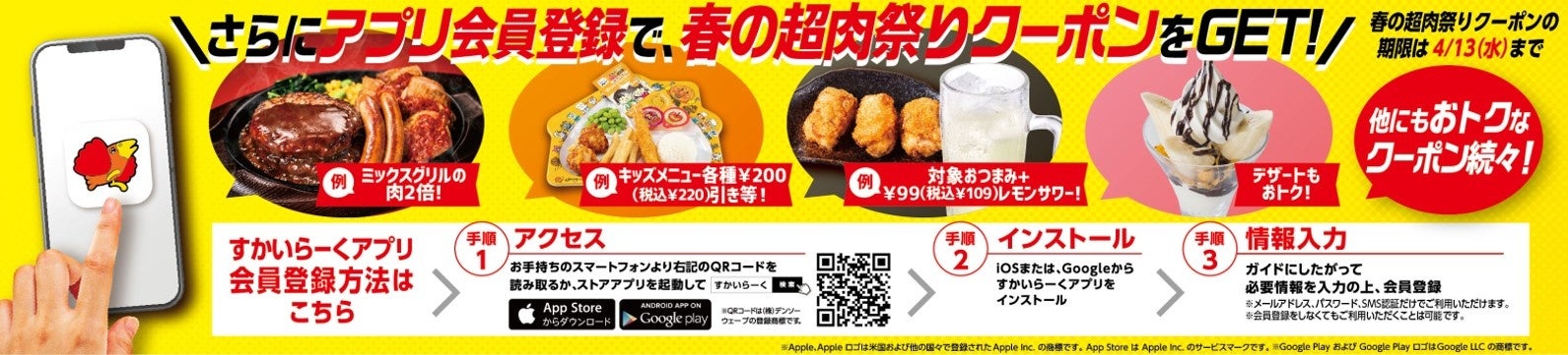 お得な「クーポン」や、事前決済可能なテイクアウト・宅配の「ネット注文」など便利な機能が多数搭載のすかいらーくアプリ。「春の超肉祭り」キャンペーン期間中は、アプリ会員限定クーポンも配信中。