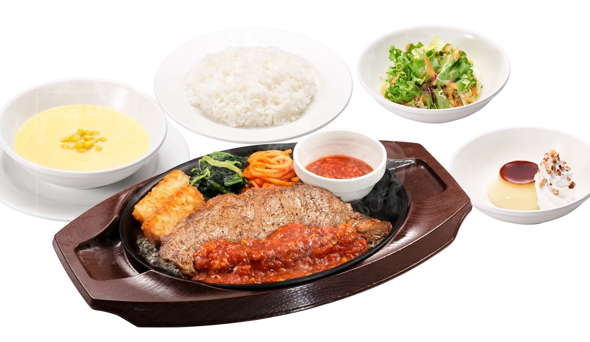 柔らかくジューシーなアメリカ産アンガスビーフのサーロインを使用。サーロインステーキに、ライス・サラダ・ポタージュスープ・プチデザートまで付いたスペシャルコースをこのお値段で提供。