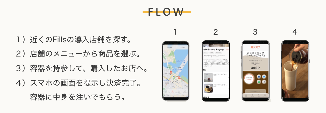 2022年4月1日には新たなプラスチック新法(プラスチック資源循環促進法) が施行されるなど企業、自治体、飲食店、そして生活者と一人ひとりがアクションを起こさなければならない段階となりました。Fillsは、ドリンクやフードの”中身だけ”を買う・売ることができ、スマホと容器さえあれば、スグに利用を開始できます。