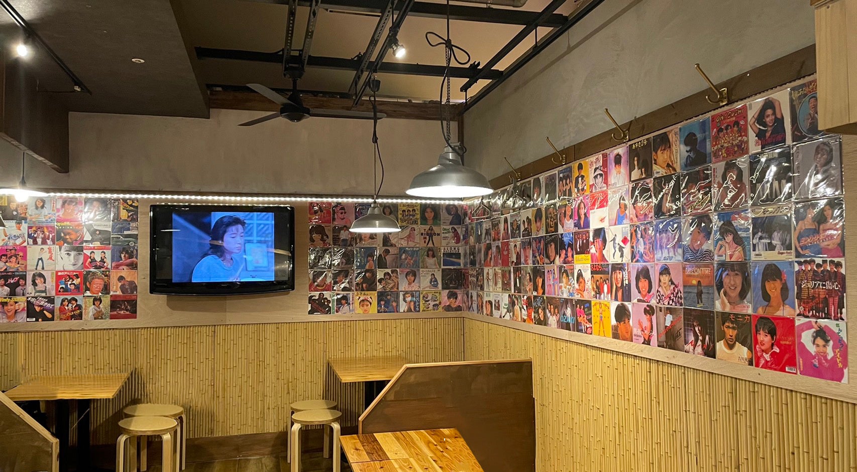昭和生まれの方々には「青春時代・小さい頃の懐かしさ」が蘇り、平成生まれの方々には「お洒落感覚で新鮮さ」を感じていただけるよう昭和を思わせるノスタルジックな内装に。一歩店内に入るとどこからか懐かしBGMが聞こえ、広がる異空間にタイムスリップ。今では見なくなったホーロー看板、ピンクの公衆電話や名盤のジャケットなど懐かしの貴重な骨董品がずらり。さらに、店内モニターでは昭和人気番組が流れ老若男女、世代問わずに楽しめるお店となっています。実家や故郷に帰るような感覚で、是非お気軽にお立ち寄りください。
