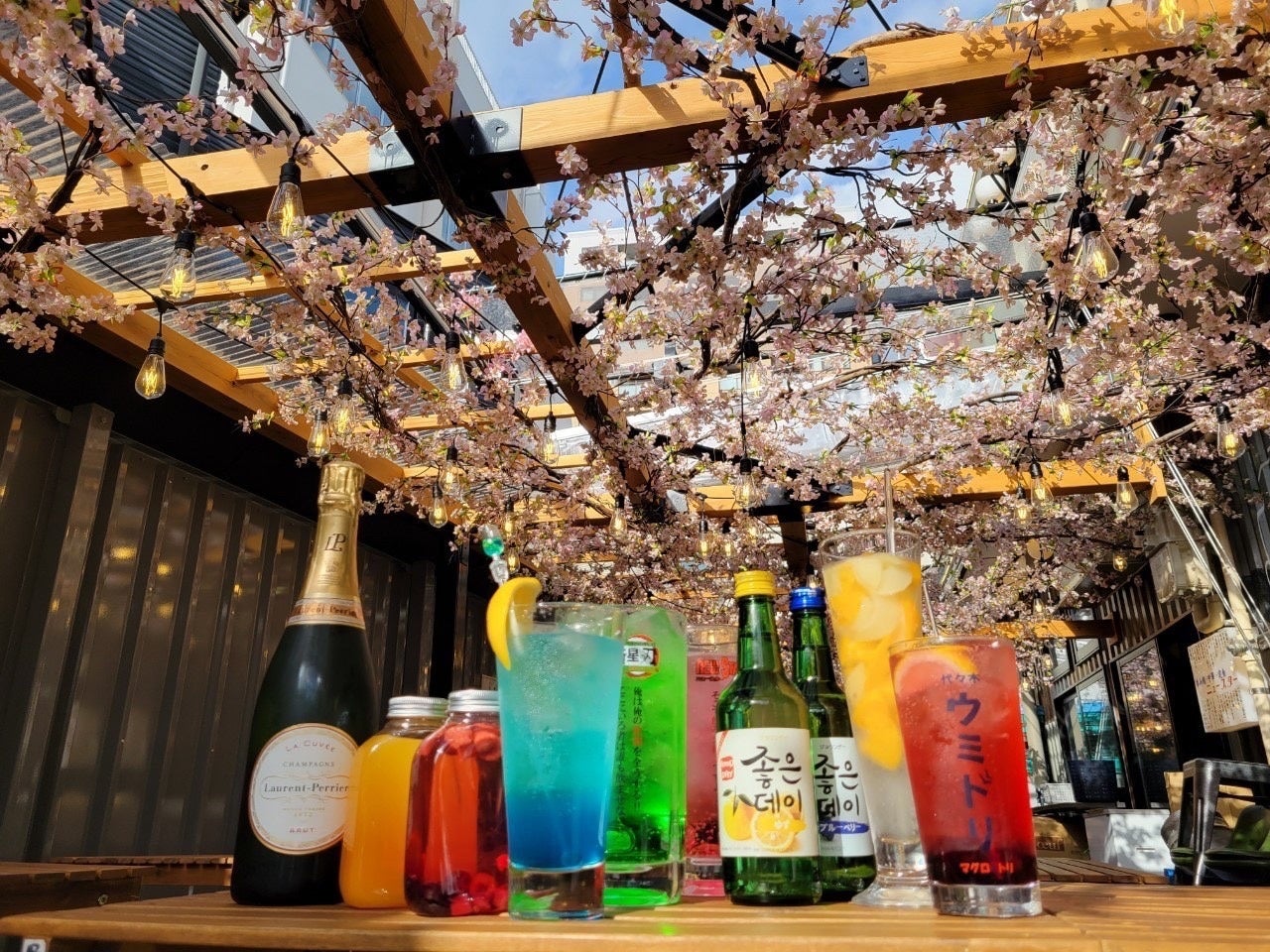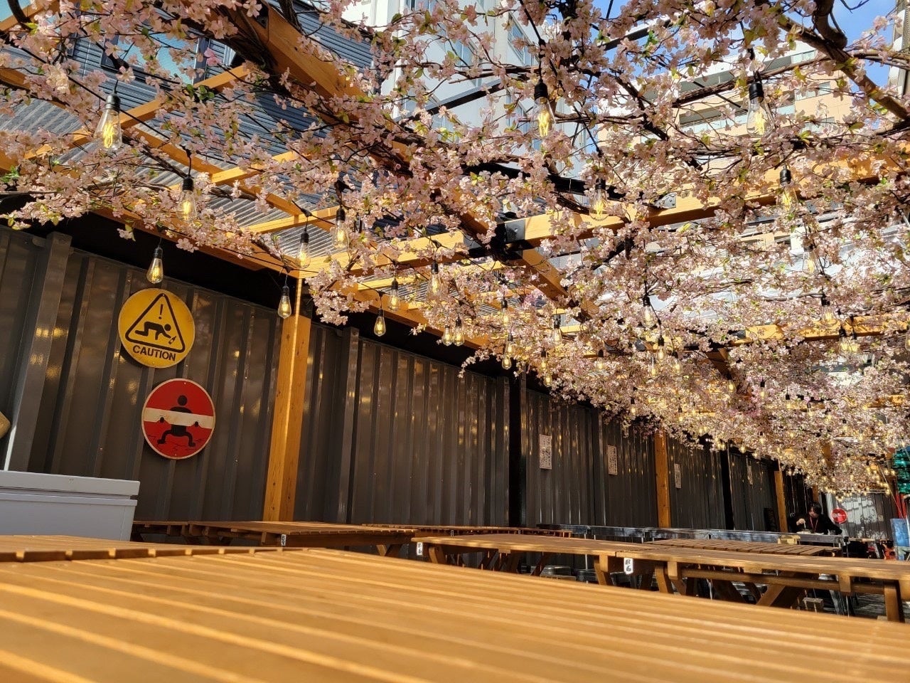 関東では徐々に開花の知らせが届いておりますが、『ほぼ新宿のれん街 倉庫別館』では一足先に満開となりました!!倉庫内の通路やテラスは見上げると一面の桜で彩られており、華やかで春らしい雰囲気の中でお食事をお愉しみ頂けます。特にテラス席は暖かな陽気も相まって、過ごしやすくなっておりますので昼飲みシーンにも是非ご利用下さい。