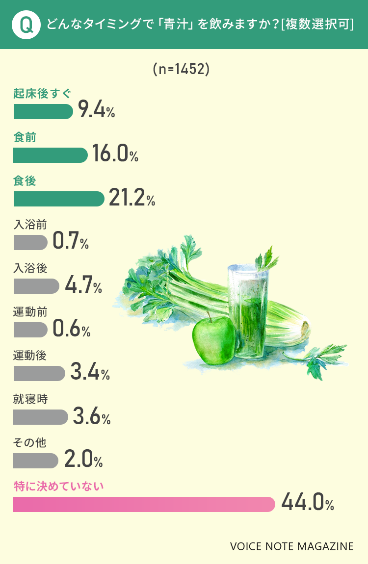 青汁を飲んでいるボイスノート会員1452人に青汁を飲むタイミングについて聞きました。