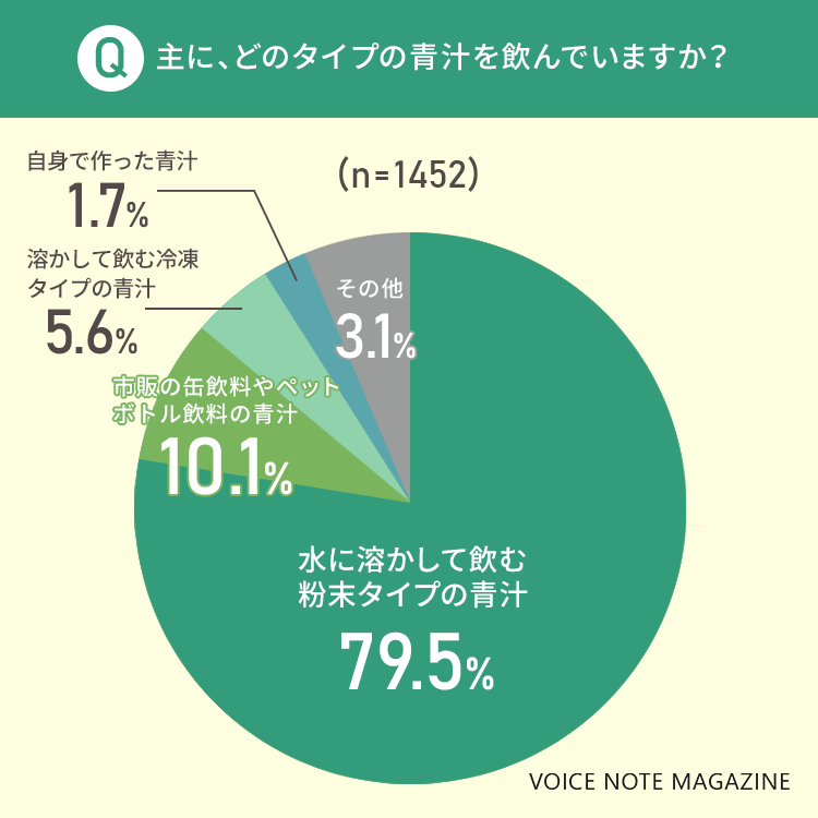 8割近くの方が「水に溶かして飲む粉末タイプの青汁」を使っているそうです。