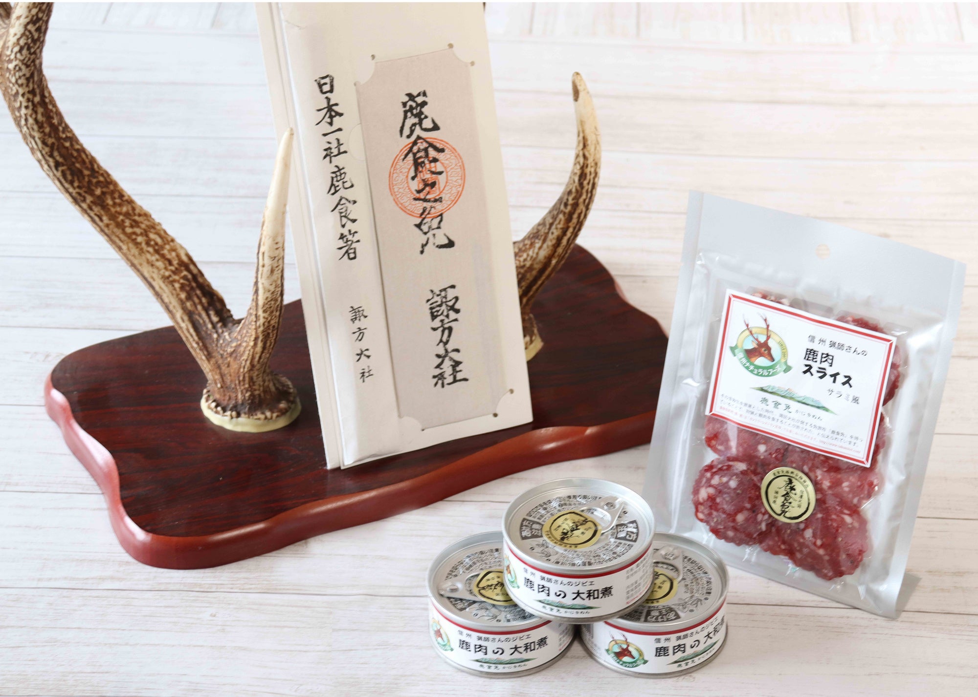 信州ナチュラルフーズは、契約猟師により捕獲された鹿・猪・熊などを、速やかに処理・解体・包装・冷凍保存・加工・販売している、信州ジビエ専門の精肉販売の会社です。信州ジビエを使った加工食品は、諏訪大社が肉食の免罪符として配布したお札「鹿食免(かじきめん)」の表示とご献上品表示の許可を得て、地域の特産品として定着しています。今回は、手軽に信州ジビエを楽しんでもらえる商品「鹿肉のサラミ」「鹿肉の大和煮」をご用意します。