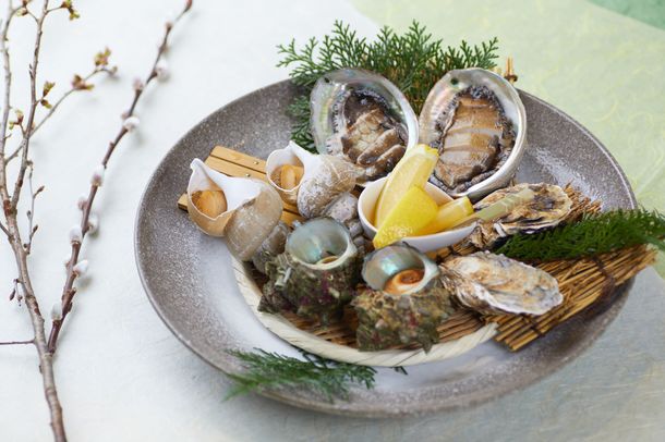 ・「アワビ」「サザエ」「牡蠣」「バイ貝」を炭火でお召し上がりいただく貝鮮焼き。