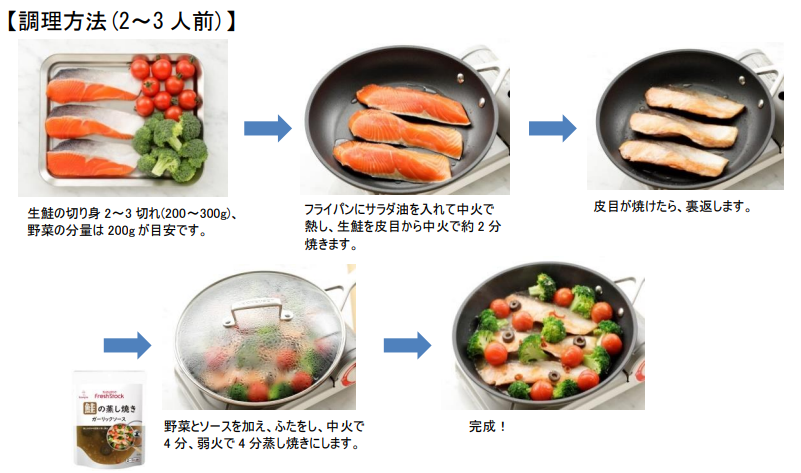 『フレッシュストック®』の「鮭の蒸し焼きソース」は、野菜と魚の切り身などをフライパンで調理するだけで、魚のおかずができる専用調味料です。