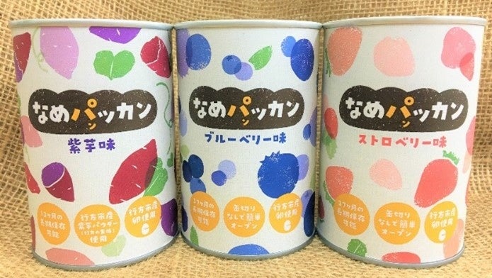 地元の食材を使い災害時の防災食ともなるような商品開発を目指し、長期保存が可能な缶詰めパンに着目し開発しました。食材には、行方産の卵やサツマイモパウダーを使用し、3種類(紫芋味、ブルーベリー味、ストロベリー味)の缶詰めパンとなっています。また、行方市の防災食としても活用されます。