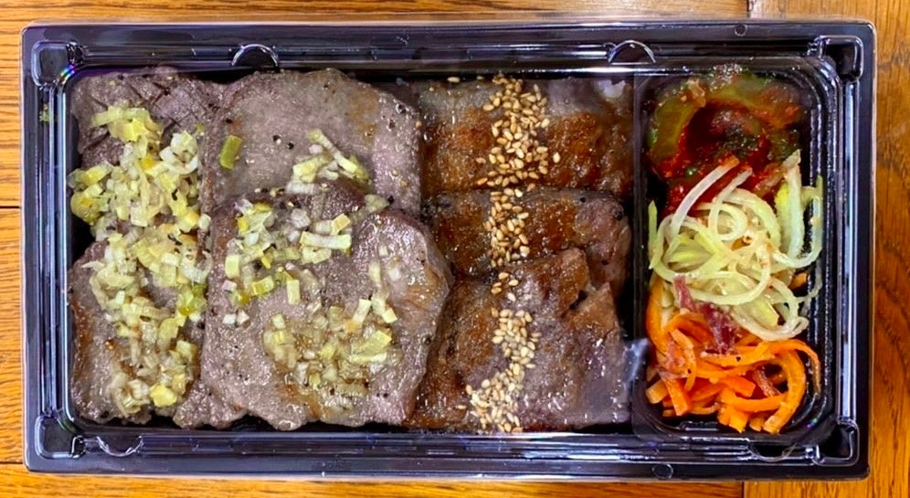 KINTANで人気の組み合わせ、30日間かけて旨味を凝縮させたKINTAN名物の「熟成牛タン」とカルビの中でも特に柔らかい“ササミ”や“カイノミ”を厳選した「上カルビ」のお弁当です。さらに修学旅行が「沖縄」の予定だったということで、沖縄の食材や郷土料理をお弁当のお惣菜として盛り込みました。