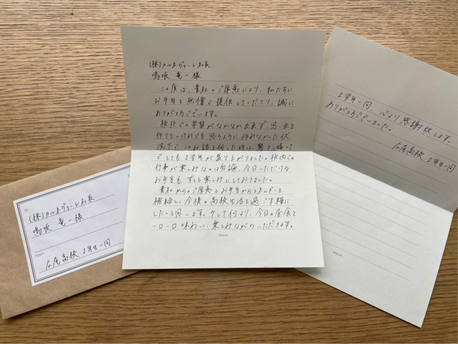 校外での学習がなかなか出来ず、思い出を作りたいけれど、作れなかった状況下でこのお話を伺ったときは驚きと嬉しさで学年がとても盛り上がりました!貴社からのご厚意とお弁当からエネルギーを補給し、今後の高校生活を過ごす糧にしたいと思います。」