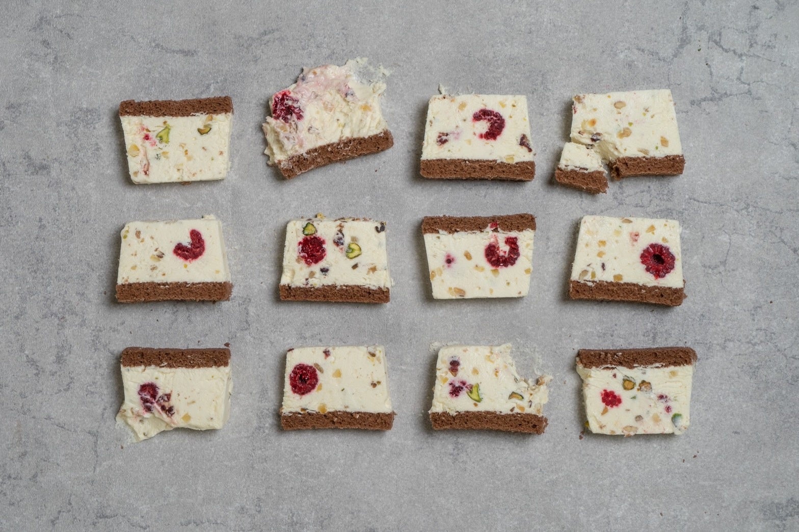 カット断面もさまざま。「The CASSATA」はラズベリーやピスタチオ、レモンなどの材料が断面を彩り、切る場所によって思わぬカタチに出会えます。