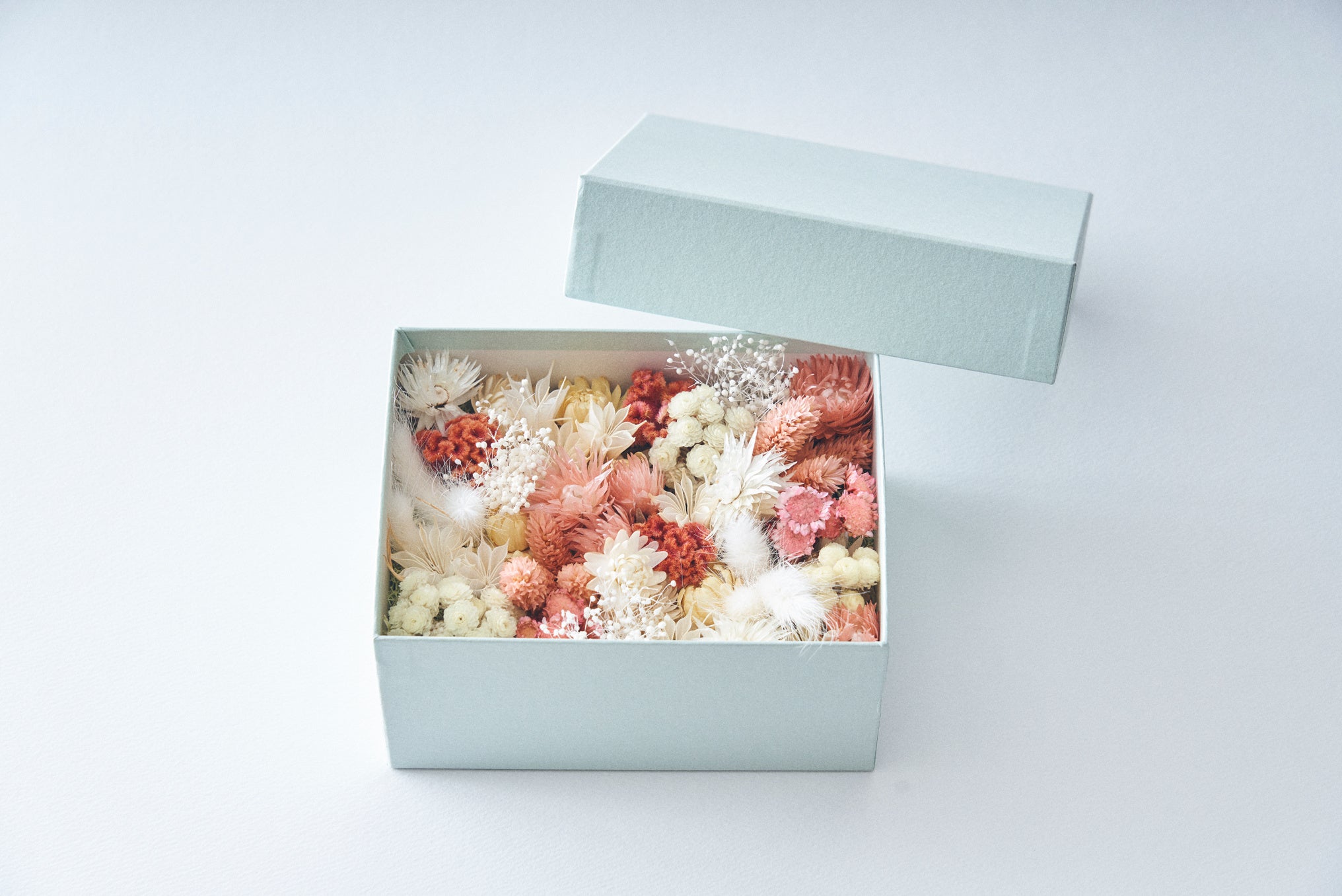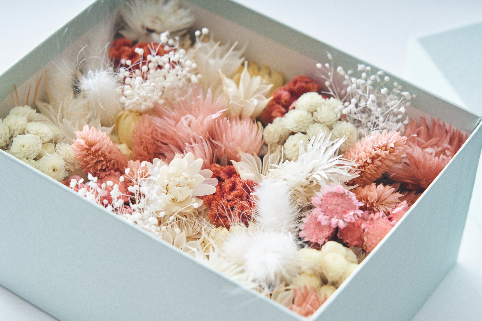 今回、笑顔をもたらすたのしいお菓子を作り続けるフェアリーケーキフェアのイメージに合わせて、guiさんに特別なボックスアレンジメントを作っていただきました。ドライフラワーやプリザーブドフラワーを使用し、ひとつひとつ丁寧に手作りされ、私たちのお菓子と一緒にお届けします。パステルカラーのボックスにギュッと詰まった色とりどりの花々を見ていると、思わず顔から笑みがこぼれてしまう、そんな幸せな気持ちにしてくれるフラワーボックスです。たくさんの感謝の気持ちを詰めて、お母さんへ「いつもありがとう」を届けてみませんか?