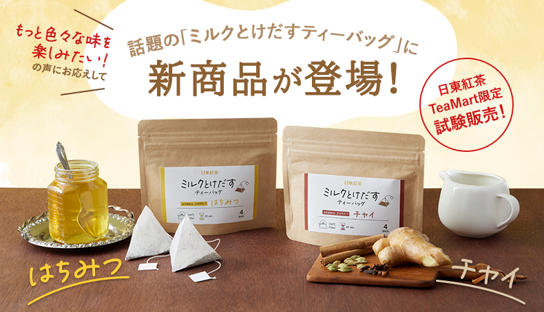 当社では、日東紅茶ファンとのコミュニケーションを通じて商品やブランドを共創し、紅茶の魅力やあらたな価値を提案していきたいと考え、それを実現する場として2021年6月に公式オンラインショップ「日東紅茶TeaMart」をオープンしました。また、2021年8月に「ミルクとけだすティーバッグ(オリジナル、アールグレイ)」の販売を開始し、SNS等でも取り上げられました。もっと色々な味を楽しみたいという声も多く寄せられ、そういったファンの皆様の声に応えるために、日東紅茶TeaMartでの「ミルクとけだすティーバッグ はちみつ 4袋入り」および「ミルクとけだすティーバッグ チャイ 4袋入り」の限定試験販売を企画しました。