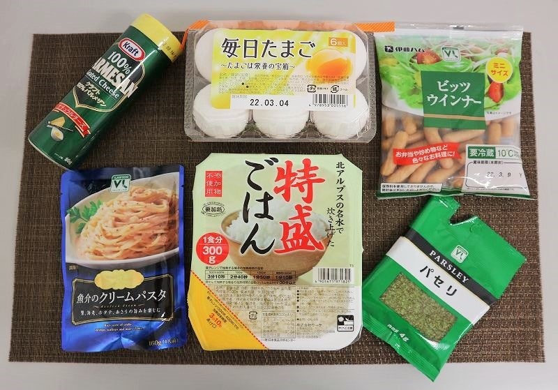 パルメザンチーズ 80g(本体価格375円/税込405円)/たまご 6個/VLビッツウインナー 96g/VL魚介のクリームパスタ 160g/北アルプス国内産特盛ごはん 300g/VLパセリ 4g(各・本体価格100円/税込108円)