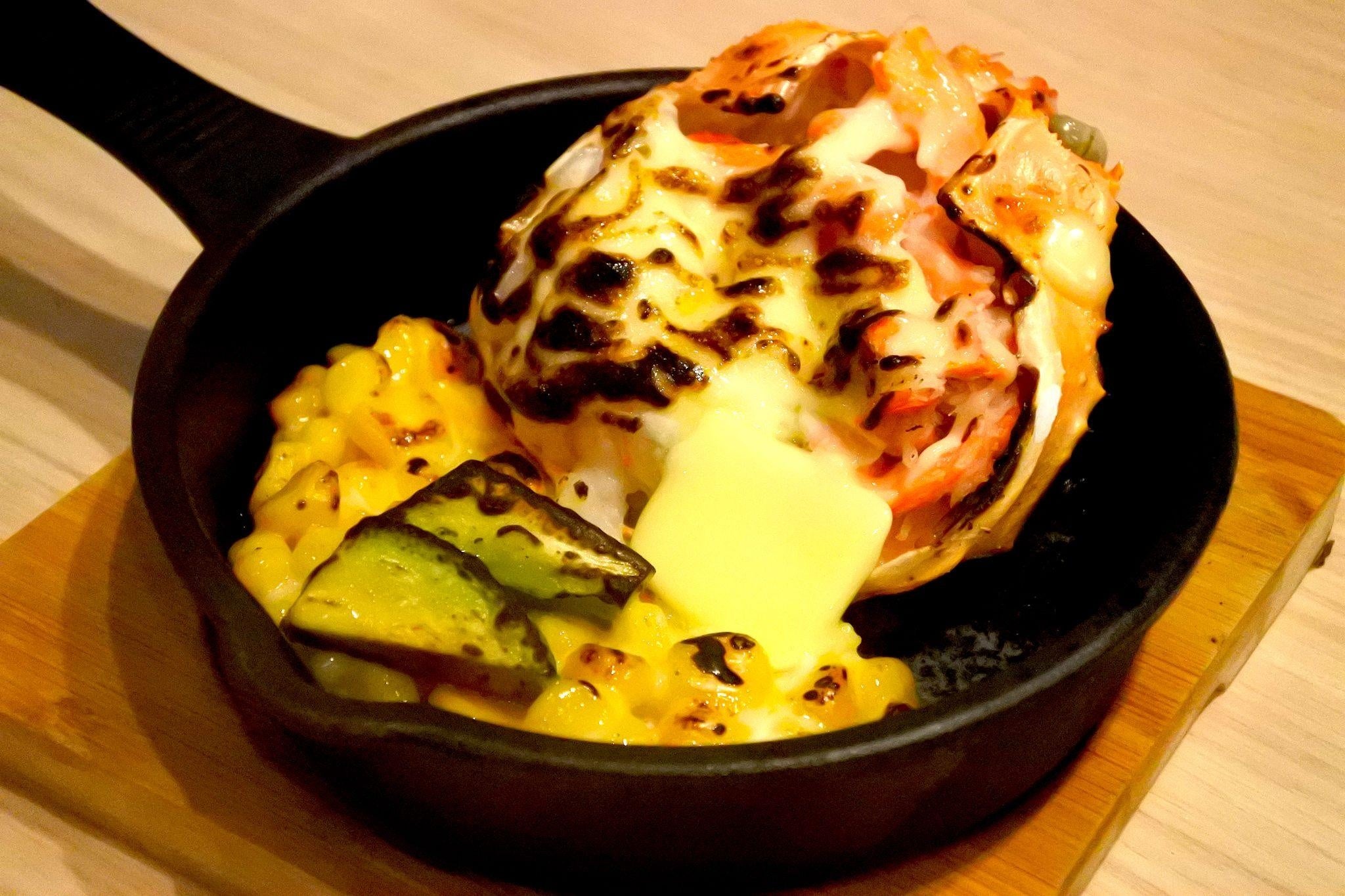 甲羅に詰められたバターの乗ったエビと蟹身が、お客様の目の前でスタッフが調理をします。バーナーで炙った時の香ばしい香りが食欲を一気に掻き立てます。