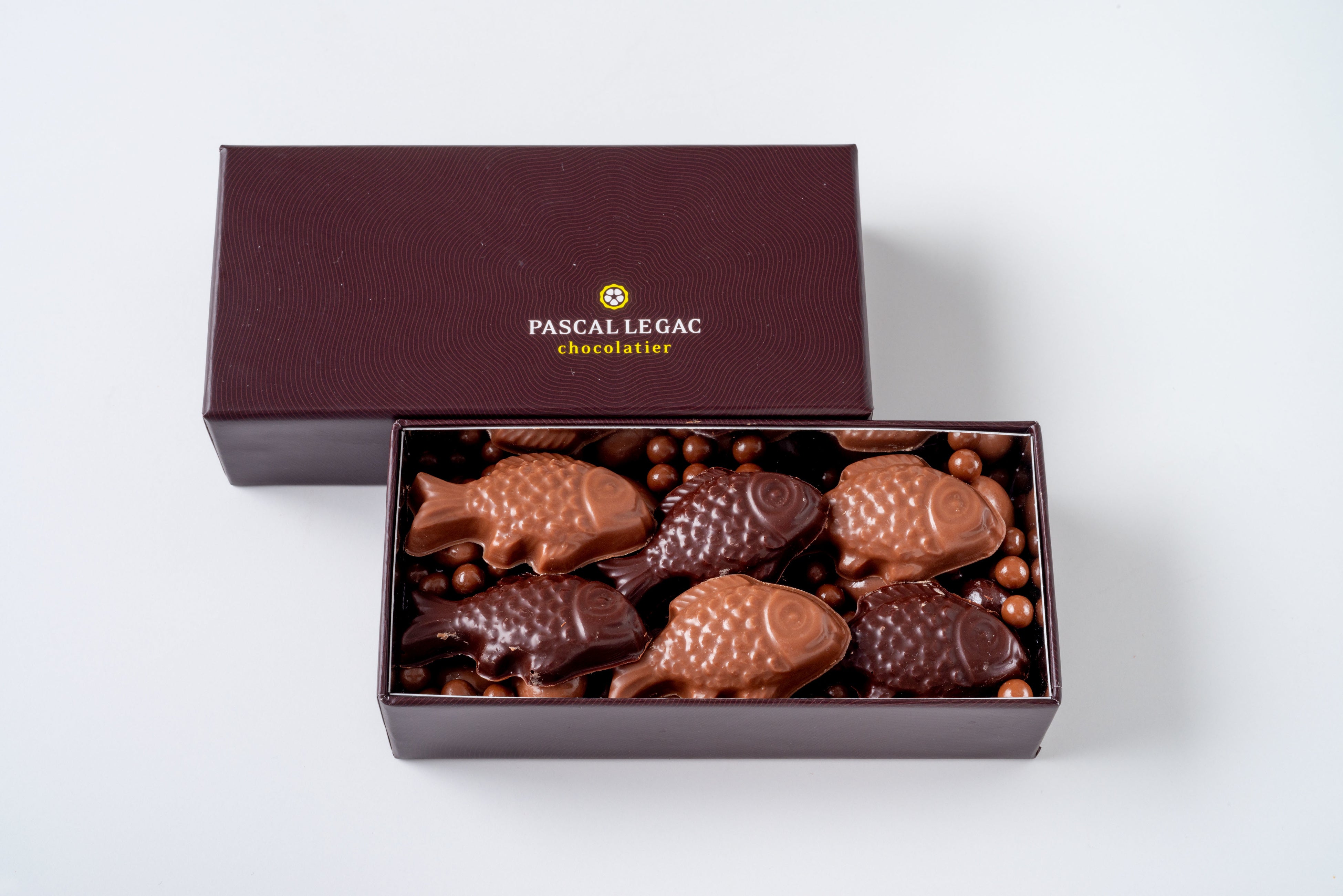 割ってみると中にはミルクとビターの魚の形のフリチュールが3個ずつはいっています。