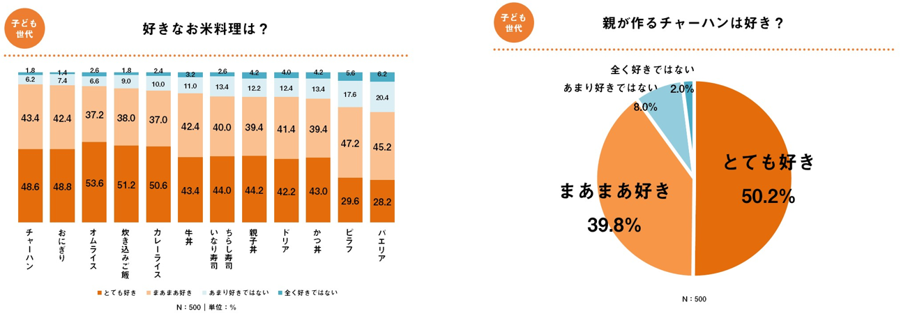一方、子どもたちの好きなお米料理を調べてみたところ、チャーハンと答えた割合が92%と、最も多いという結果に。さらに、過半数の子どもたちが、親がつくるチャーハンを「とても好き」と答え、「まあまあ好き」と答えた人を合わせると、なんと9割もの子どもたちが親の作るチャーハンが好きだということが判明しました。