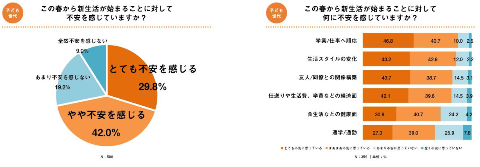 新生活について「とても不安を感じる」と答えた人は3割にのぼり、「やや不安を感じる」と答えた人を合わせると、7割以上の子どもたちが、新生活のスタートに不安を感じていることが分かりました。不安の中身は、「学業/仕事への順応」「生活スタイルの変化」「友人/同僚との関係構築」「仕送りや生活費、学業などの経済面」が特に多く、8割近くの子どもたちが、それらの不安がコロナ禍で、よりいっそう高まっていると感じているようです。