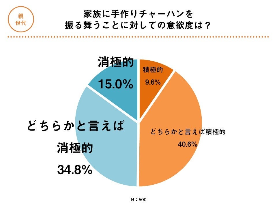 そこで、家族に手作りチャーハンを振舞うことに積極的か消極的かをたずねたところ、ママ・パパの半数が”消極的”という現実が明らかになりました。
