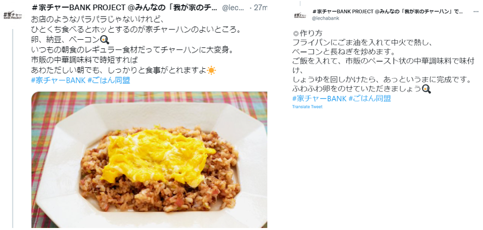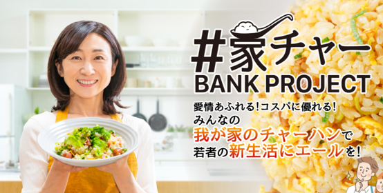 「#家チャーBANK PROJECT」は、有志のママ・パパたちが、愛情あふれコスパに優れた我が家のチャーハン“ #家チャー ” のレシピを持ち寄ることで家庭でのチャーハン作りをサポートし合い、期待と不安のなか新生活を迎える子どもたちを、家庭の味がもたらす「安らぎ」と「栄養」を通じて応援する取り組みです。