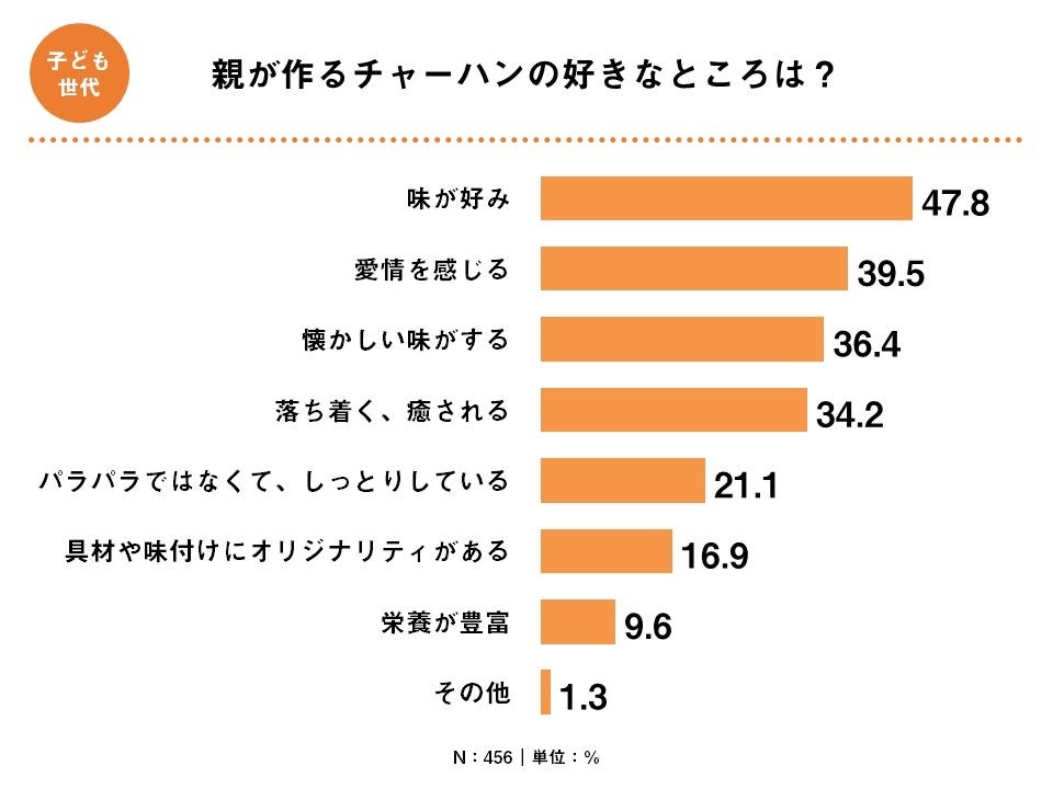 親が作るチャーハンの好きなところをたずねると、「味が好み」がもっとも多く、次いで「愛情を感じる」「懐かしい味がする」「落ち着く、癒される」といった声が多く、むしろ「パラパラではなくて、しっとりしている」ところが好きという意見も見られました。ママ・パパが感じている後ろめたさに反して、子どもたちは、親の手作りチャーハンに込められた愛情や家庭ならではの味わいに安らぎや温もりを感じ、おいしいと評価していることがわかりました。