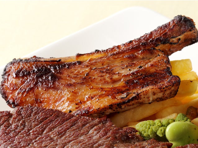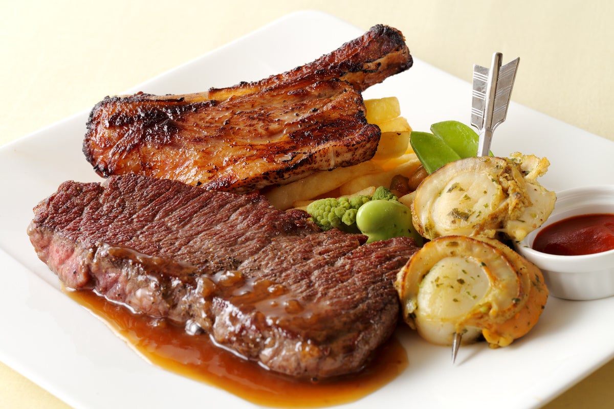 ファーストプレート(骨付きスペアリブ、牛ステーキ、ホタテのブロシェット盛り合わせ)