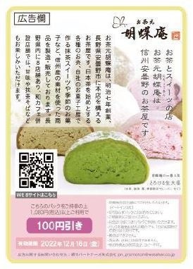 裏面には、当社グループの「お茶元胡蝶庵」店舗でご利用いただける100円割引クーポンもございます。