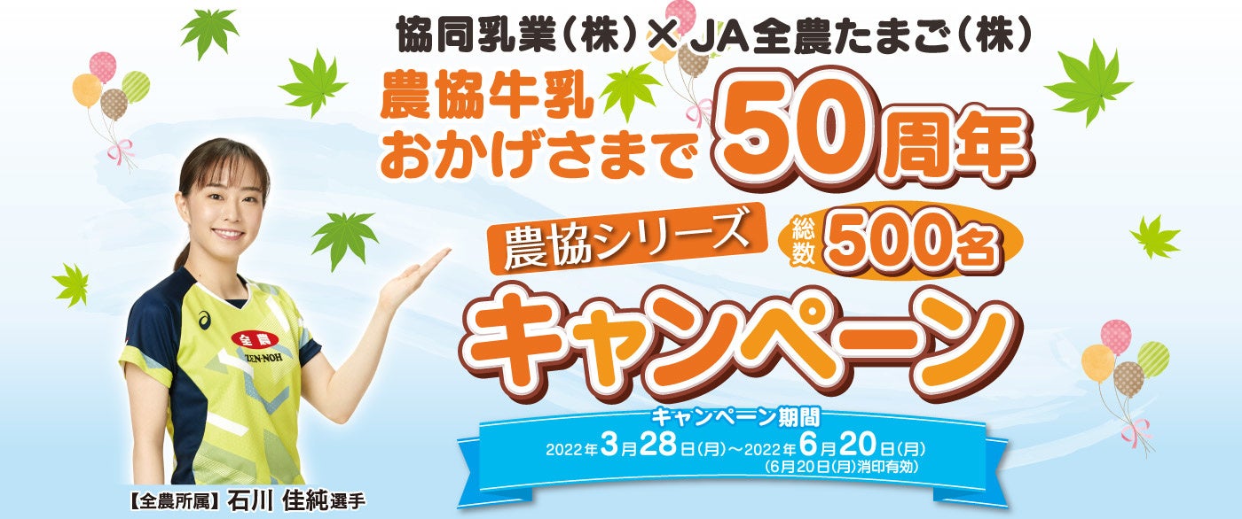 協同乳業株式会社(本社:東京都中央区、代表取締役社長:後藤 正純)はJA全農たまご株式会社と、農協牛乳発売50周年を記念し、「農協シリーズ」の対象商品をご購入いただいたお客様に「上州和牛 焼き肉用肉500g」「鳥取県産星空舞5kg」をプレゼントする「農協牛乳おかげさまで50周年 農協シリーズキャンペーン」を3月28日(月)より実施します。