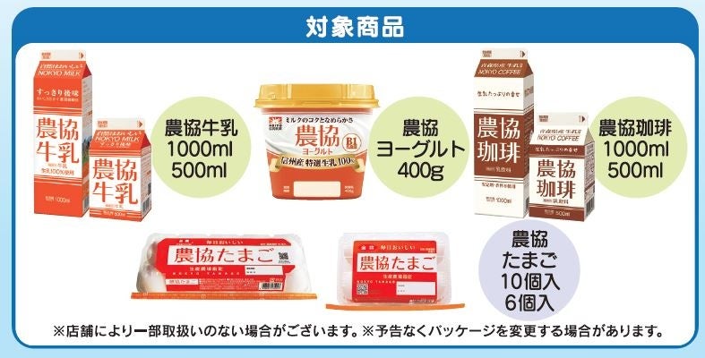 「農協牛乳 1000ml、500ml」・「農協ヨーグルト400g」・「農協珈琲1000ml、500ml(関東地区のみ)」