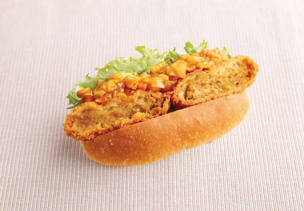 明治時代に日本海軍の軍隊食として作られた「よこすか海軍カレー」のコロッケをサンド。福神漬け入りのカレーコロッケにたっぷりのカレーソースを添えたカレーづくしのコッペ。