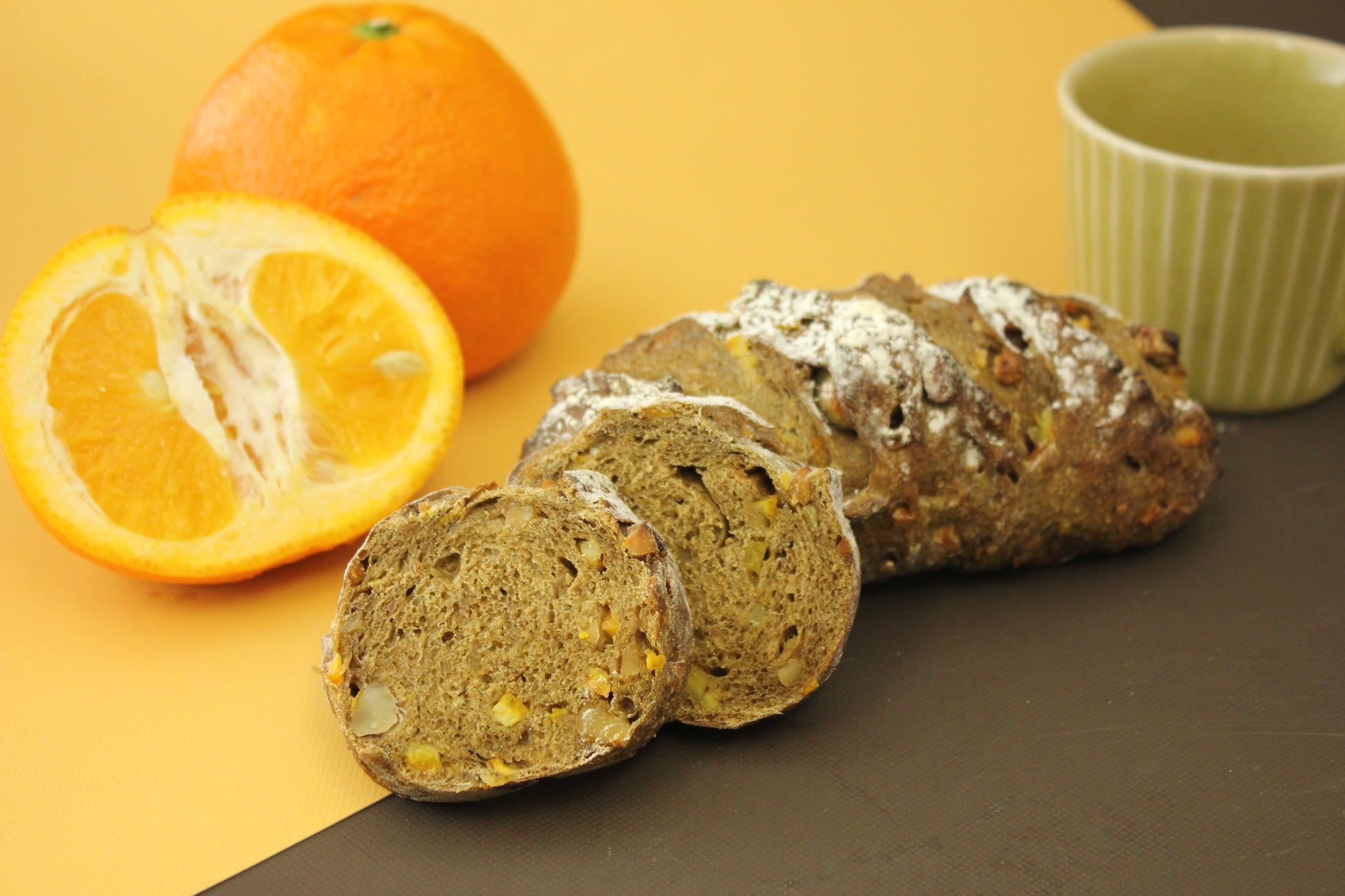 京都産ほうじ茶とくるみ、マカダミアナッツ、伊予柑を練り込みました。伊予柑のさわやかさとナッツの食感と香ばしさが楽しい、じっくりと味わいたい一品。