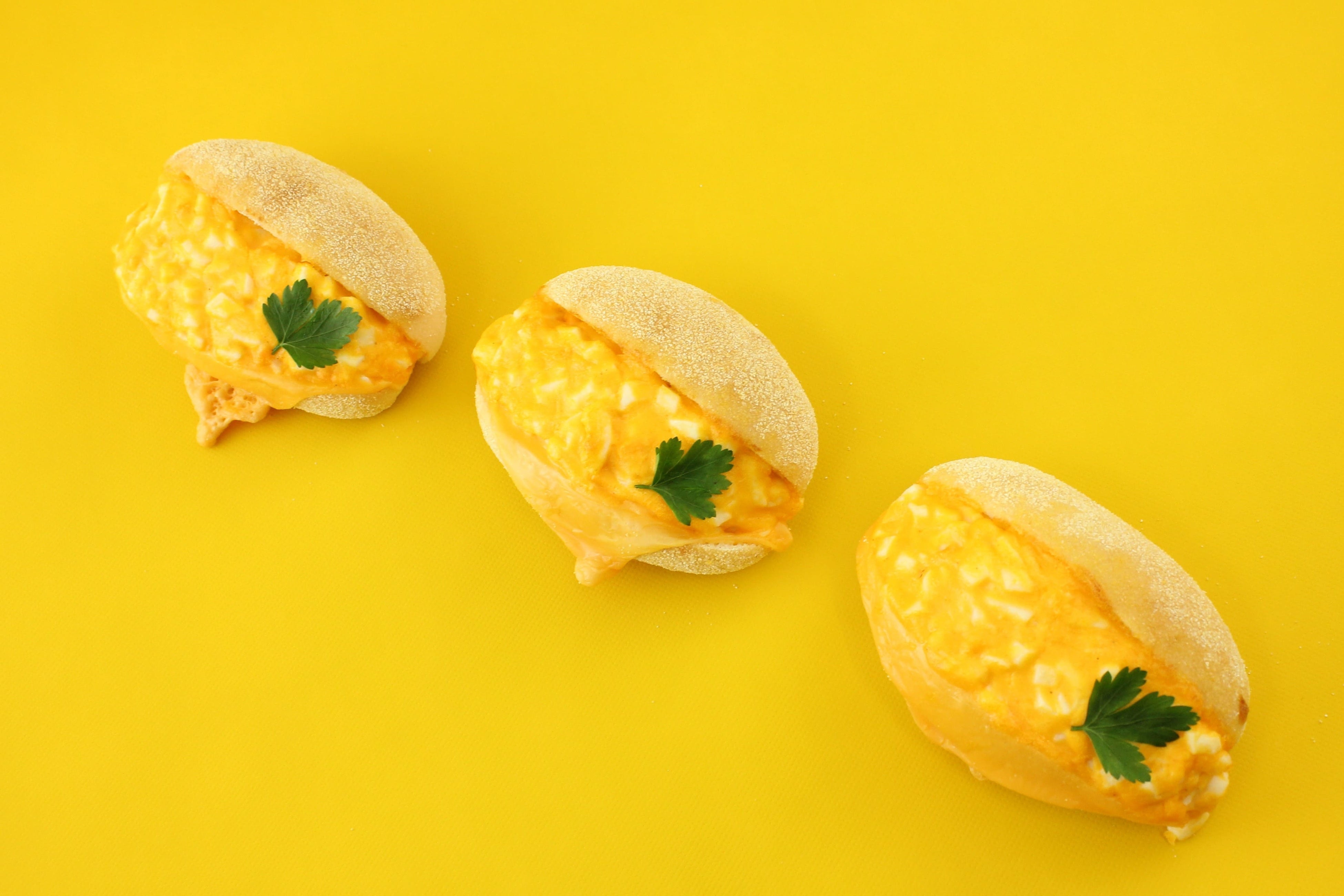 コロンとした可愛らしい見た目のフォカッチャ生地に、たまごサラダをぎっしりとサンド。表面につけたコーングリッツの食感もアクセントで、食べ応えもしっかり。