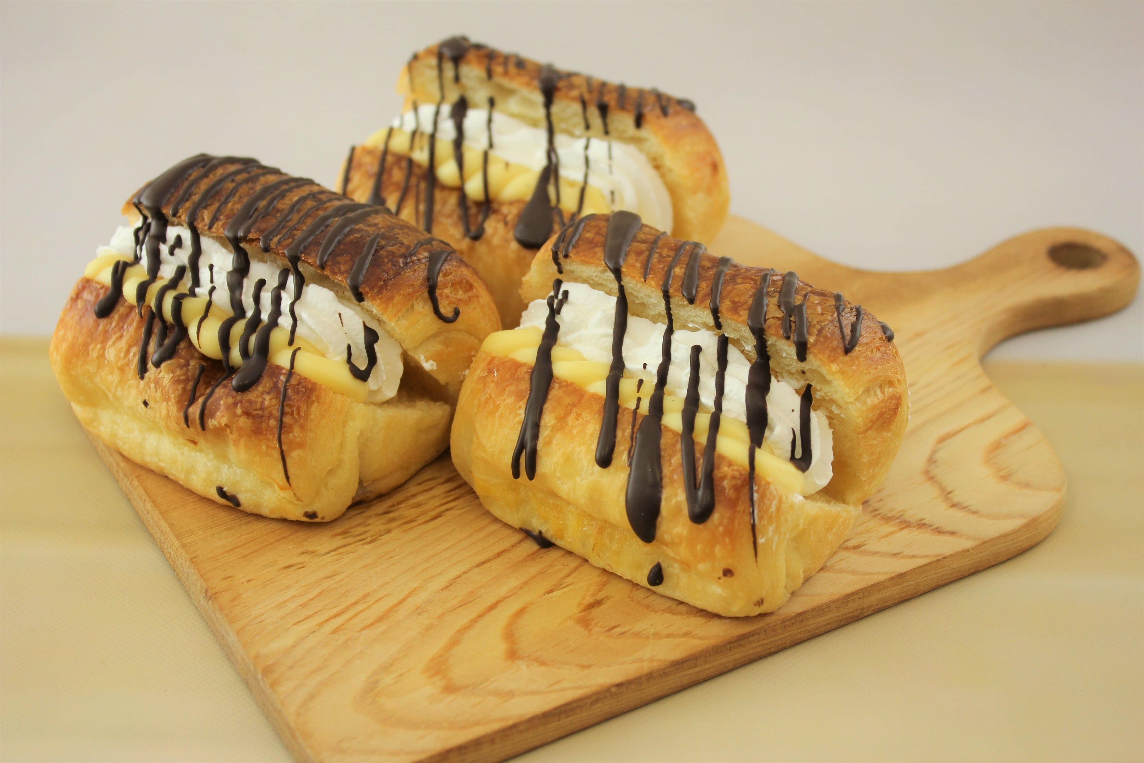 デニッシュ生地に、カスタードクリームとホイップクリームを贅沢にダブルでサンドしました。口いっぱいに頬張れば、あふれる幸せと癒し。