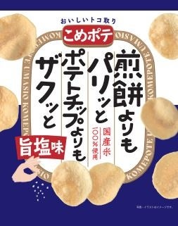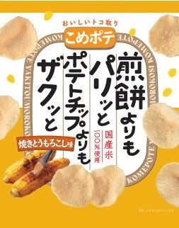 本リニューアルでは、スナックとしてより手軽にお召し上がりいただけるようスナックコーナーに陳列しても違和感がないサイズへと変更。こめポテの魅力であるパリッと&ザクッとした食感が視覚的に伝わるパッケージに刷新いたしました。