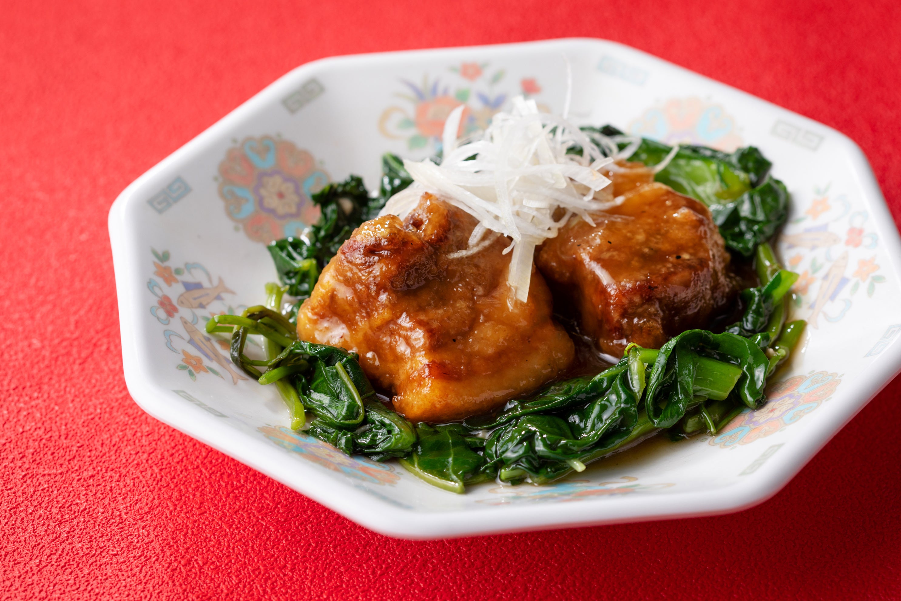 台湾で広く一般的に使用されている台湾とろみ醤油と数種類の香味野菜でじっくり煮ることで旨味と柔らかさを引き立てた逸品です。