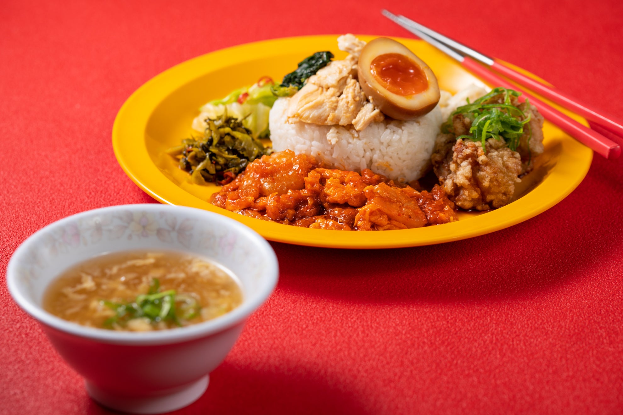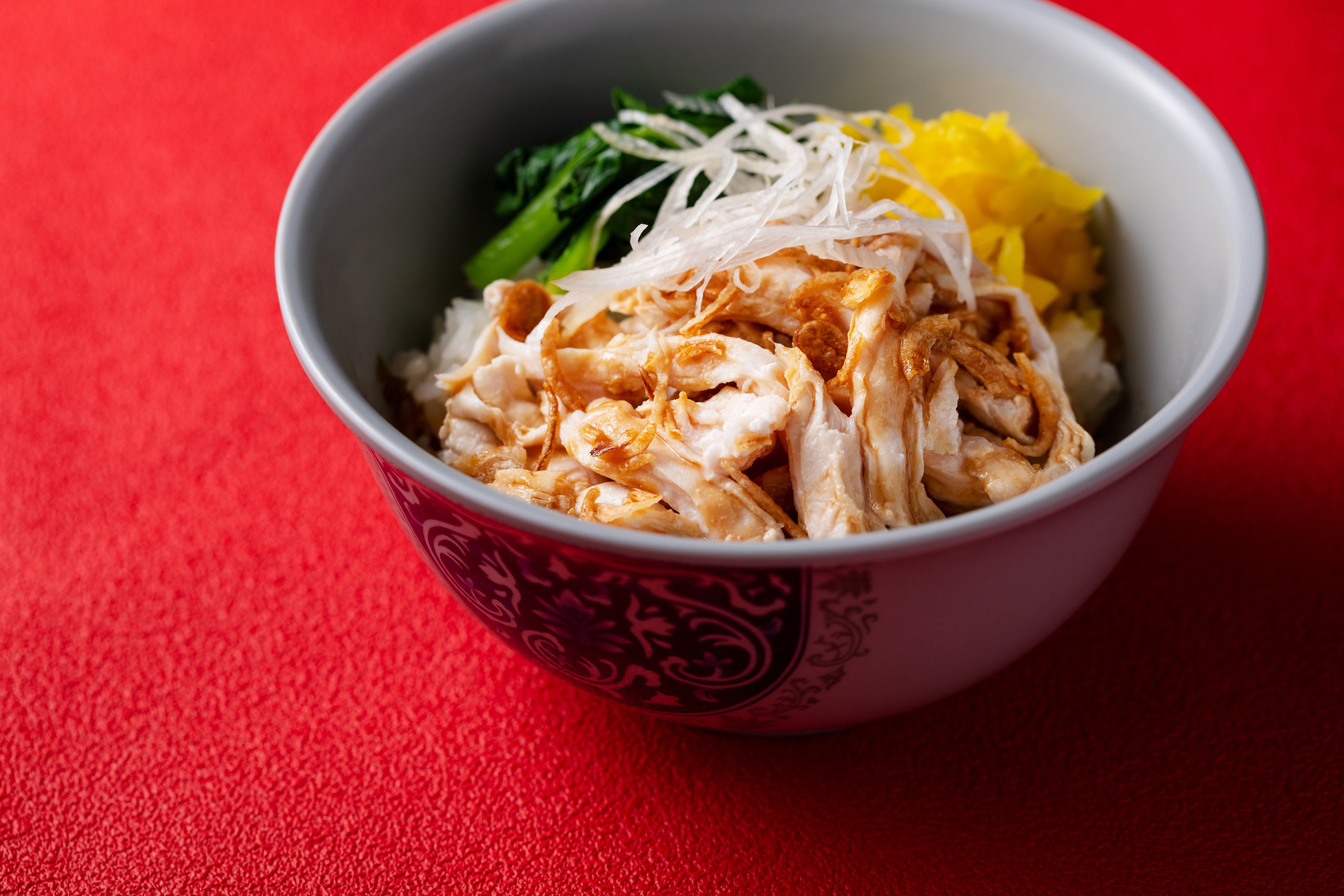 低温調理で柔らかくさっぱりとした食感の鶏肉に揚赤葱や特製の台湾甘タレ醤油をかけた台湾の国民食。有楽町限定商品