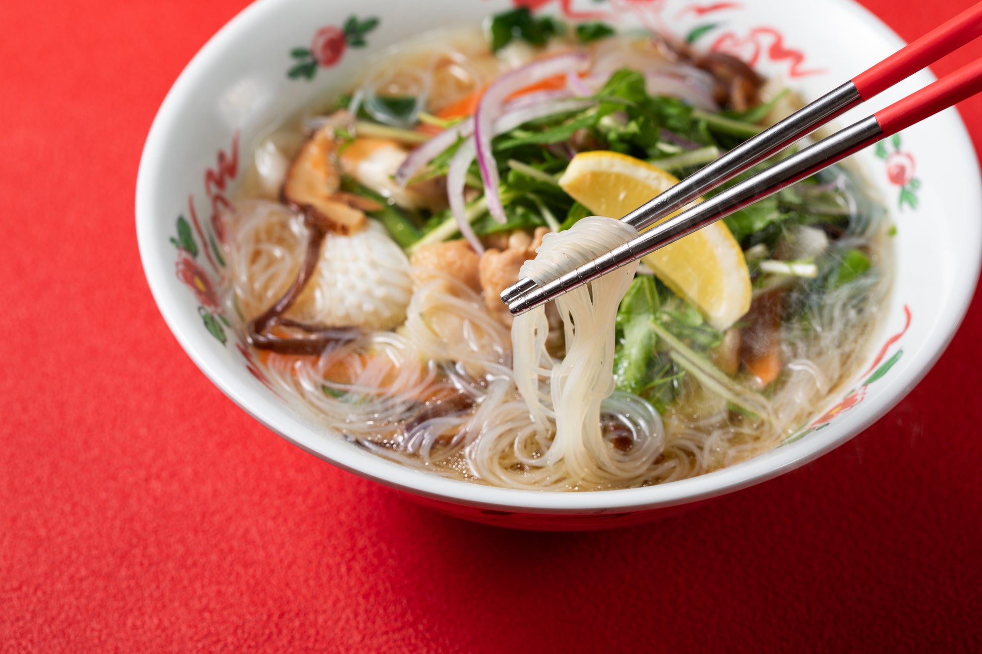 しっかりと野菜をとれる台湾料理が食べたいというお客様のお声をもとに、有楽町限定で開発しました。十三香粉のスパイスが効いた上湯(シャンタン)スープに五目の味わい、豚しゃぶとレモンによってさっぱりと仕上げました。