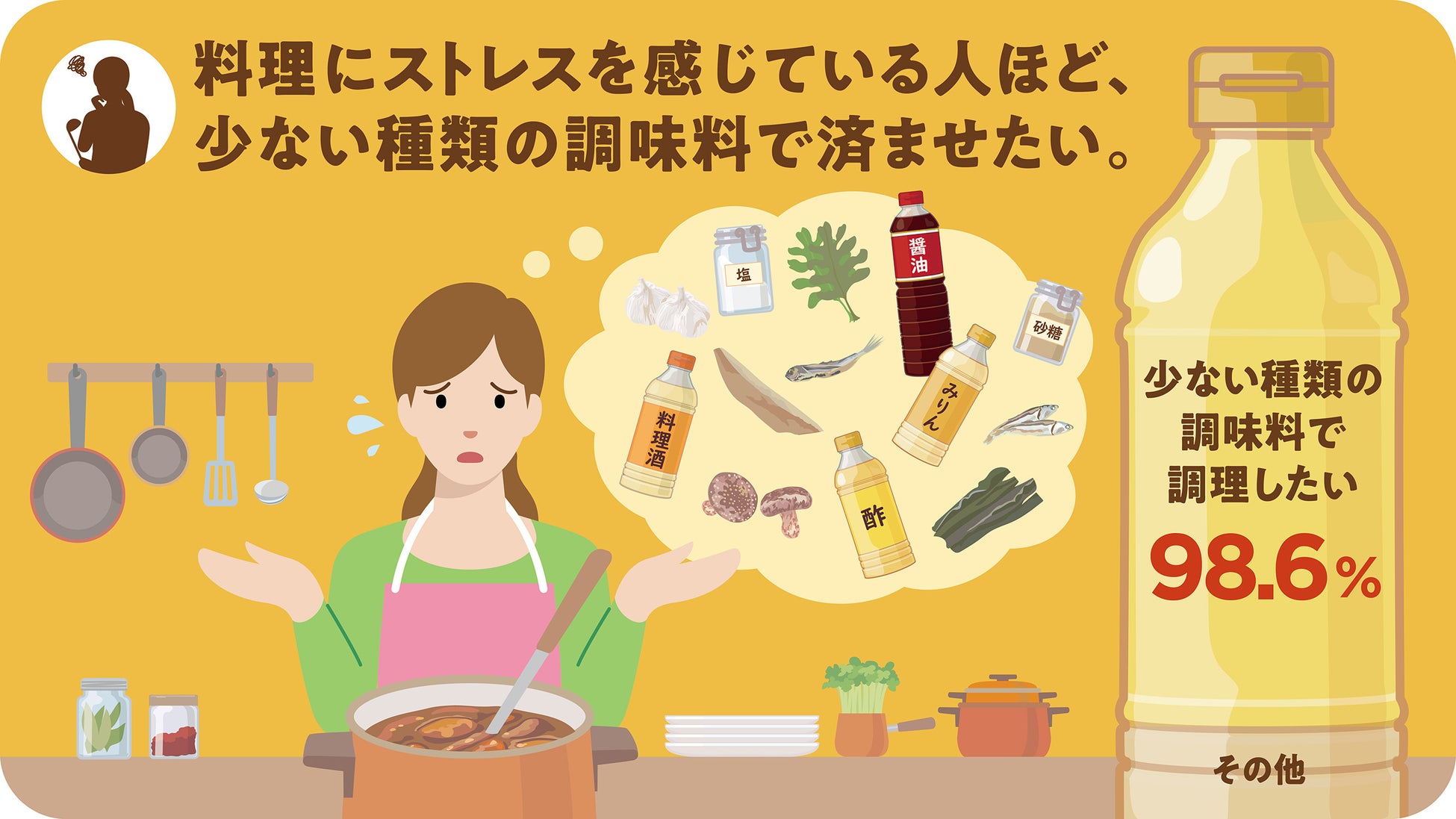 回答した。中でも、「いつもストレスを感じている」人の98.6%が「少ない種類の調味料で調理・料理をしたい」と回答し、“調味料の省略化”にニーズが高まっていることが確認できた。
