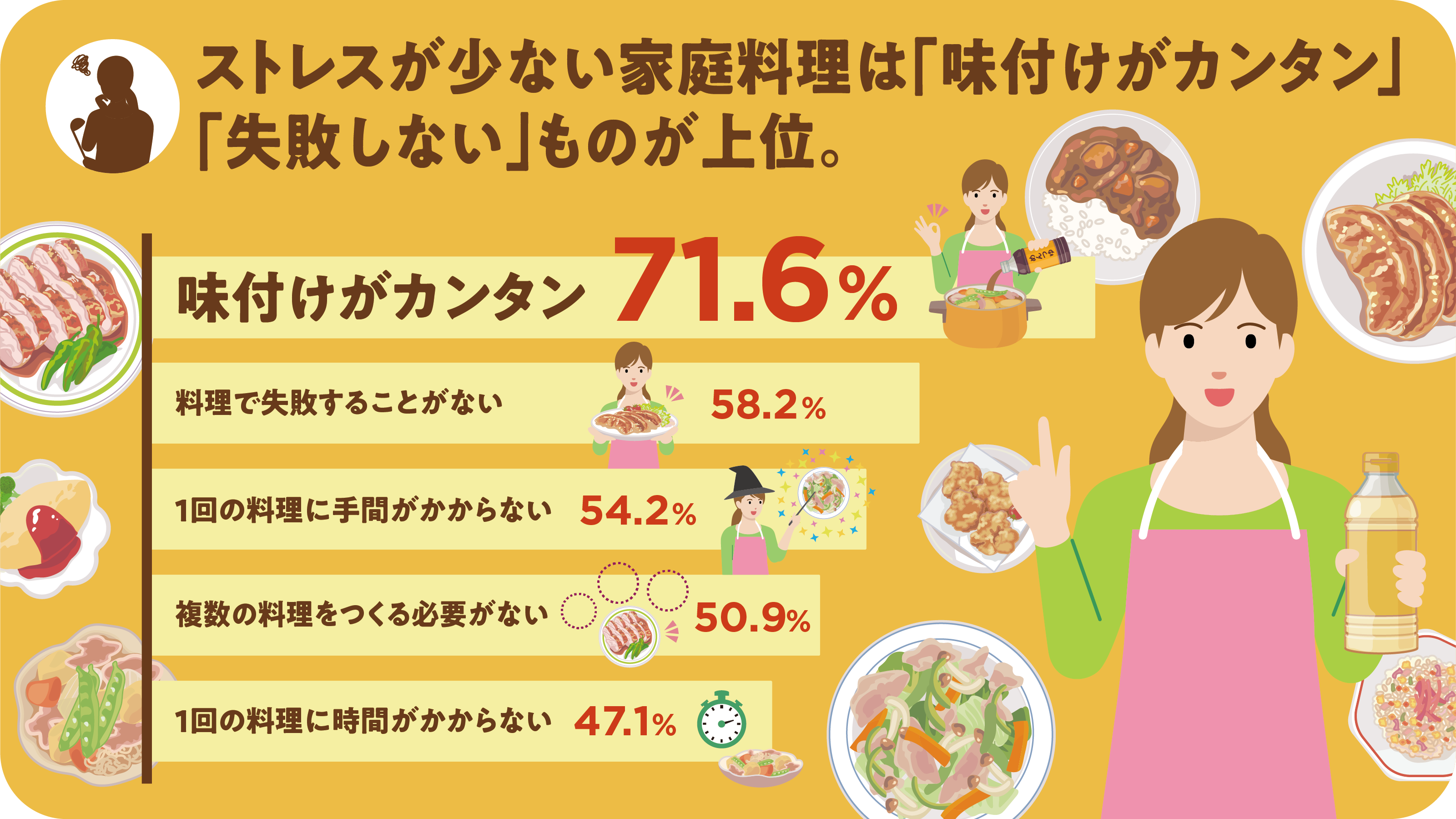 料理ストレスの低いメニューランキングの上位には「カレー」「チャーハン」「豚の生姜焼き」が並んだ。理由として、「味付けがカンタンだから」71.6%。次いで、「失敗しないから」が58.2%。コロナ禍での料理ニーズは、“味付けの手間を減らし、失敗しない料理”であることが明らかとなった。