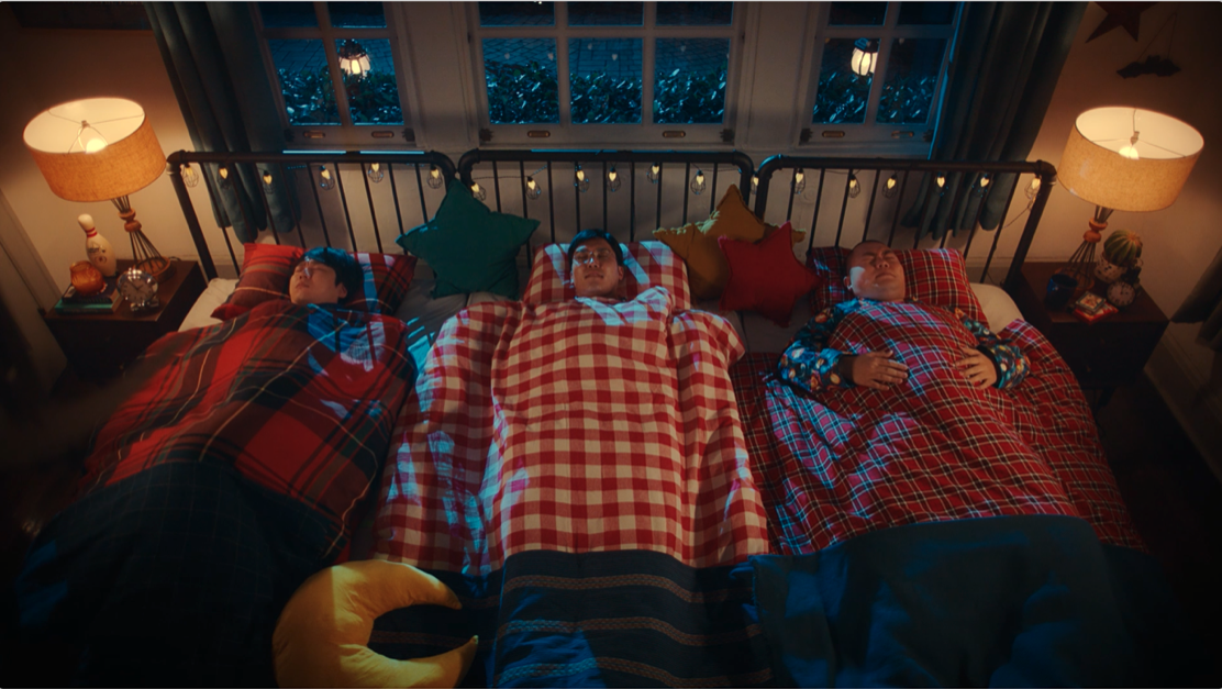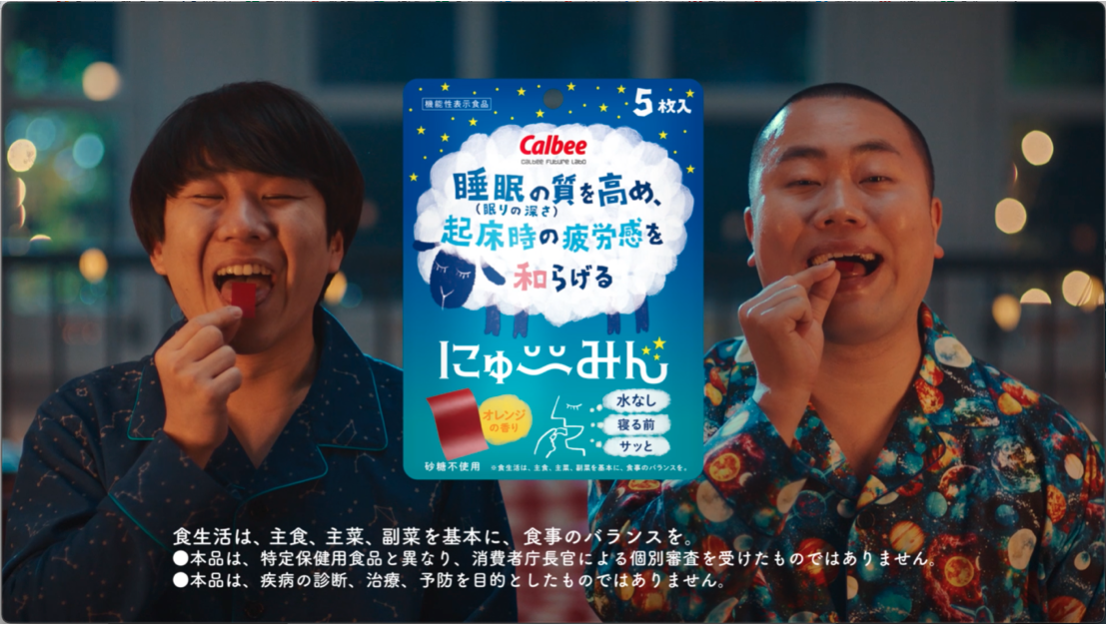 コンテンツスタジオ CHOCOLATE Inc. (本社:東京都渋谷区、代表取締役:渡辺裕介)は、カルビー株式会社(本社:東京都千代田区、代表取締役社長:伊藤秀二)が提供する睡眠サポート食品『にゅ〜みん』のTVCM・WebCMを公開したことをお知らせいたします。本動画は『にゅ〜みん』のプロモーションとして制作されたもので、本番を翌日に控えた夜にベットで眠るお笑い芸人トリオのハナコが登場。菊田一人がぐっすりと眠っているなかで、緊張にうなされてしまう秋山・岡部が『にゅ〜みん』を使用して睡眠の質を高め、すっきりとした目覚めで翌日を迎えるまでの様子を描いています。