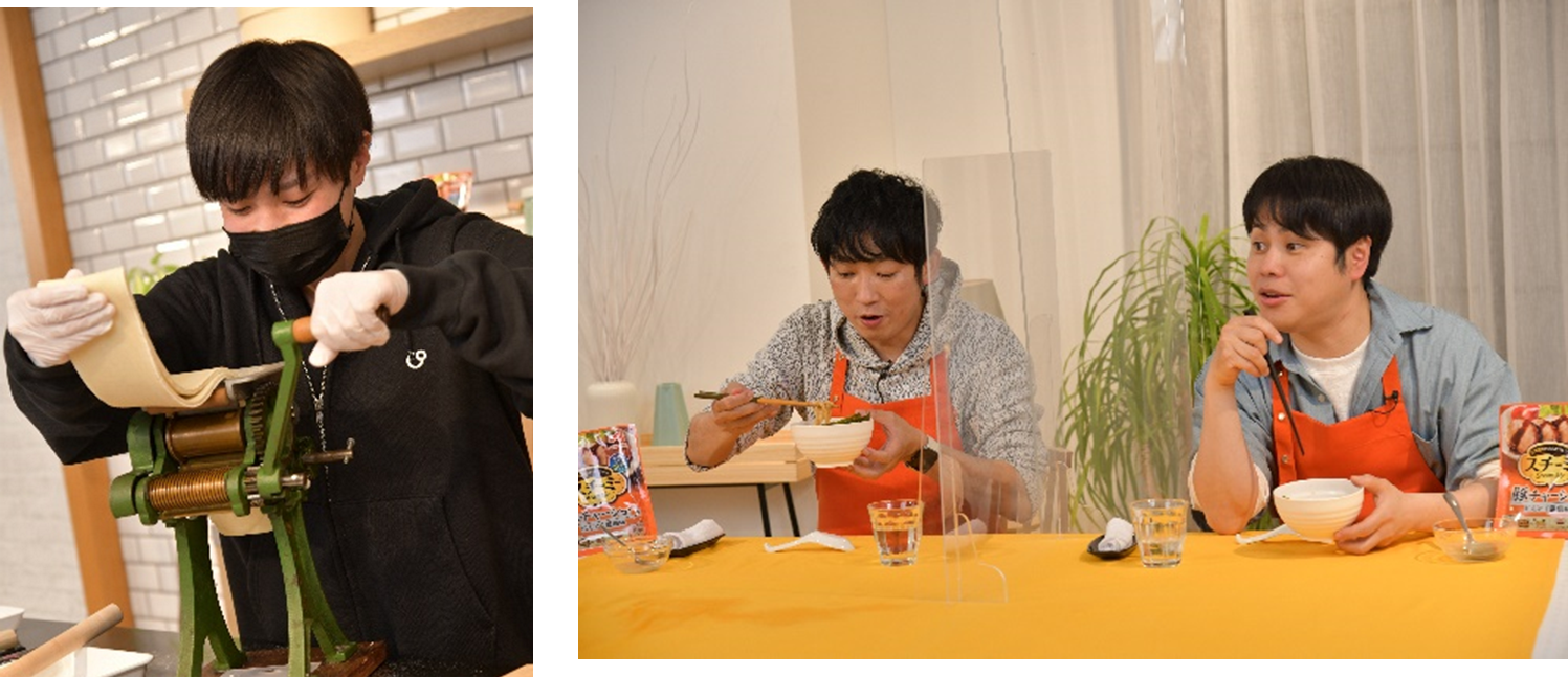 今回の自作麺に乗せるチャーシューづくりには、当社のアツすぎる「スチーミーⓇ」担当、青貫が登場。豚のかたまり肉を「スチーミーⓇ」に入れ、1分ほど揉み込みながら、長時間煮込んだような豚チャーシューがレンジで簡単に作れる「スチーミーⓇ」の2つのポイントを熱弁しました。そして肝心の麺作りでは、本来長州さんがNON STYLEの二人に教えるはずが、なぜか逆にNON STYLEの二人が長州さんに教えるというまさかの展開に。