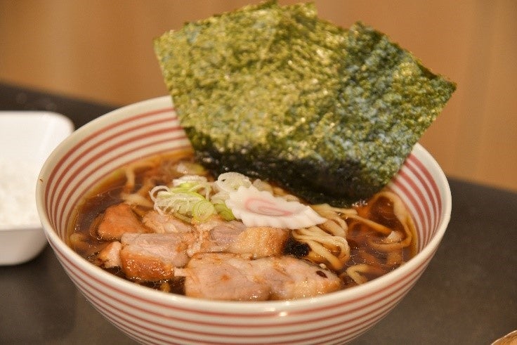 ⑥事前に用意したスープに、茹であがった麺を入れトッピングを盛り付けして完成