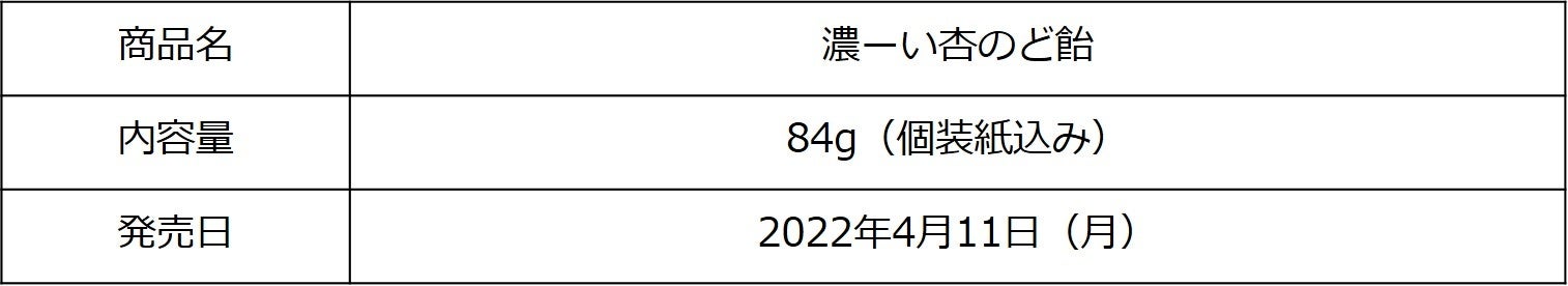「濃ーい」シリーズは、2004年の『濃ーいブルーベリー』発売以来、さまざまな風味のハードキャンディを販売しています。現在『濃ーい苺』や機能性表示食品の『濃―いブルーベリー アイクリア』など6アイテムを展開し、手軽においしく栄養素が摂れる栄養機能食品のキャンディとして、お客様にご支持いただいています。今回新たに、ビタミンCの栄養機能食品である『濃―い杏のど飴』を発売することで、袋キャンディ市場の活性化と「濃ーい」シリーズのブランド強化を図ります。