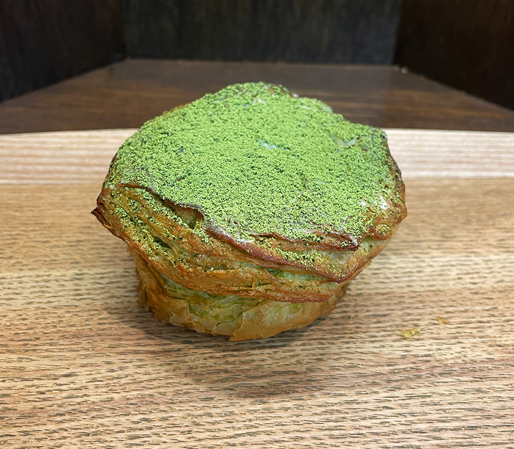 抹茶のデニッシュ生地にカレーフィリングを乗せ焼き上げ、マスカルポーネチーズ、抹茶をトッピングしました。