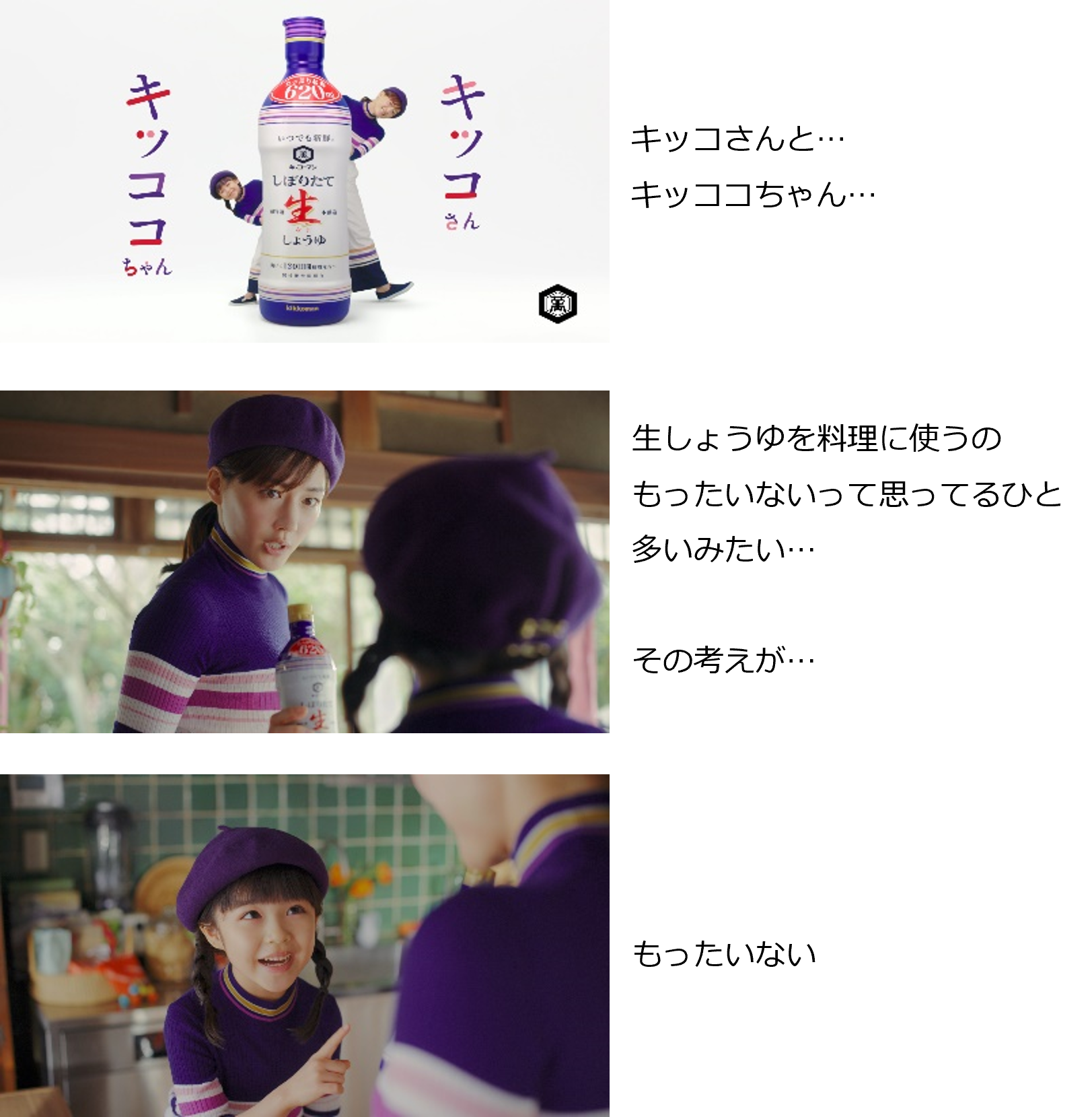 新CMでは、綾瀬さんと柚凪ちゃんが、『いつでも新鮮 しぼりたて生しょうゆ』キャラクターのキッコさん、キッココちゃんに扮し、仲良く料理に挑戦しました。生しょうゆを料理に使うことが“もったいない”と感じている視聴者に向かって、(その考えが)「もったいない」と息ぴったりに声を揃える2人。そして調理中のフライパンに「ズルいほど旨くなる」生しょうゆをひとまわし。