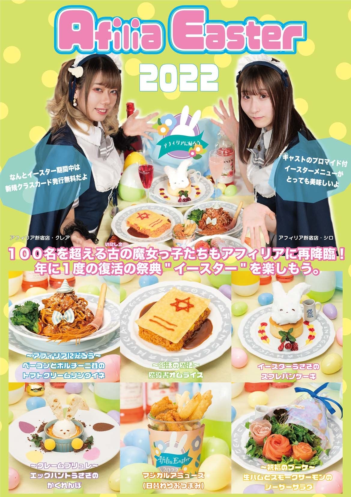 全国に6店舗を構え、多くの魔女っ子がお手伝いするコンセプトカフェ「アフィリア魔法王国(運営:クリアエムイー株式会社)」では、4/1~4/30より「アフィリア・イースター2022」を開催します。期間中は魔女っ子キャストのブロマイドが貰える限定イースターメニューや、100名以上のOGキャストが復活する復活祭など、毎日楽しいイベントが盛り沢山です!