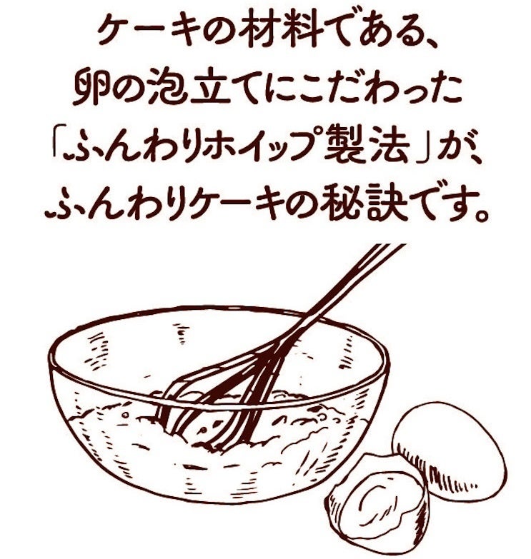 - 卵の泡立てにこだわった、「ふんわりホイップ製法」がふんわり食感の秘訣です。