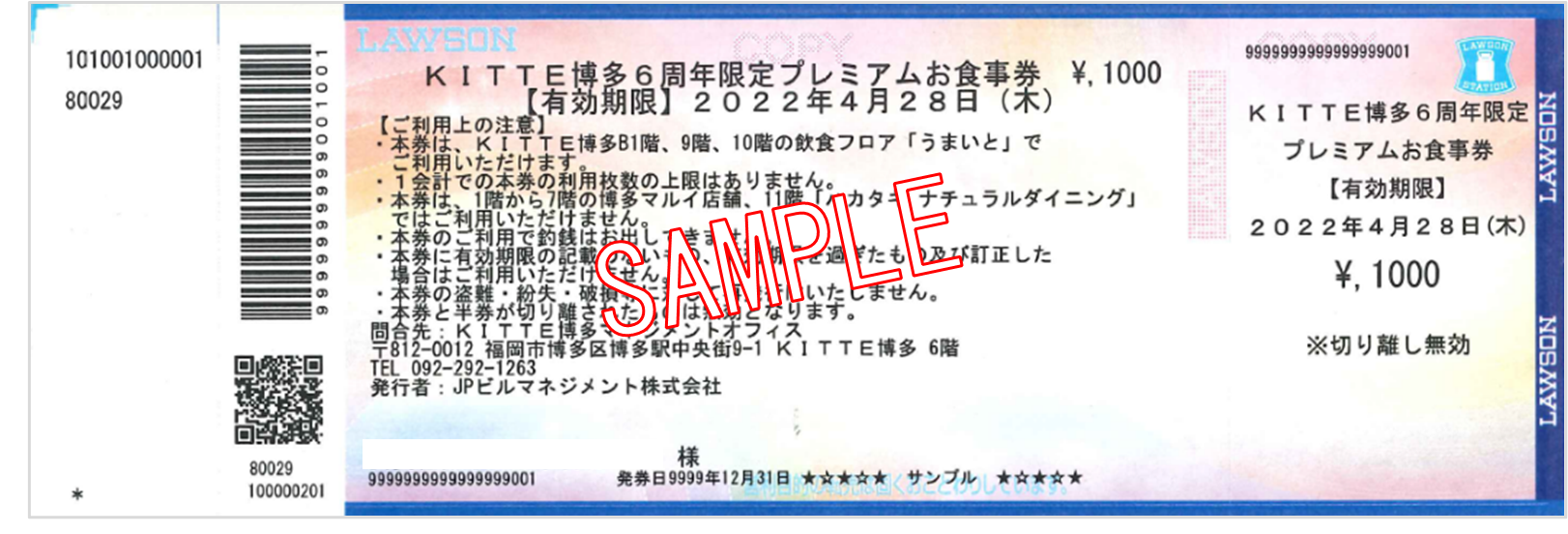 KITTE博多レストラン&カフェ「うまいと」(B1・9F・10F)の店舗で利用可能なお食事券1,000円分を、600円で販売、10,000枚の限定販売になります。『6年限定プレミアムお食事券』は、チケット販売サイト「ローチケ」、またはローソン、ミニストップに設置されている「Loppi(ロッピー)」で、いつでも、どこでもお買い求めいただけます。